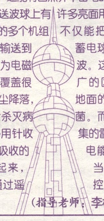 蓄电抑尘塔由多用针、吸光送波球、蓄电球、支撑柱四部分组成。塔顶的最上方是多用针,既可以避雷,还能将自然界中雷电的能量加以收集。吸光送波球上有许多亮面用于吸收太阳光。球内的多个机组不仅能把太阳能转化为电能,输送到蓄电球,而且能把电能转化为电磁波。这种电磁波发出后可以覆盖很广的区域,它使空气中的灰尘降落,地面的灰尘不能扬起,同时杀灭病菌。而下面的蓄电球就将多用针收集的雷电能量和吸光送波球吸收的电能转化为照明电储藏起来,当用户需要用电时,通过遥控就可以送电了。