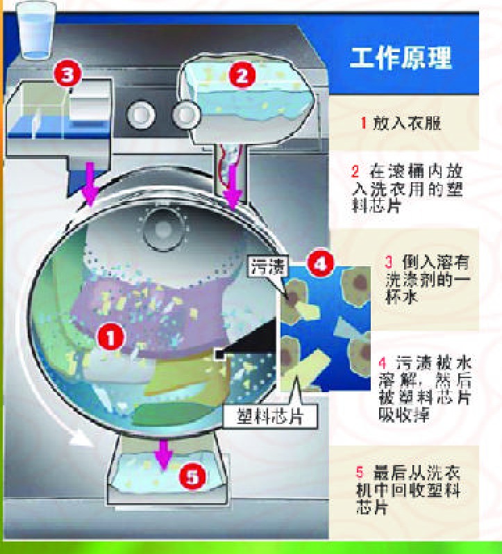 英国发明家近日发明出一种新型洗衣机,洗衣服只需要一杯水。事实上在整个过程中衣物一直处于干燥状态。这种洗衣机利用数千个塑料芯片产生作用,吸收和清除污渍。在清洗过程中,水被加热,帮助溶解污渍,然后利用塑料芯片将它们吸收掉。