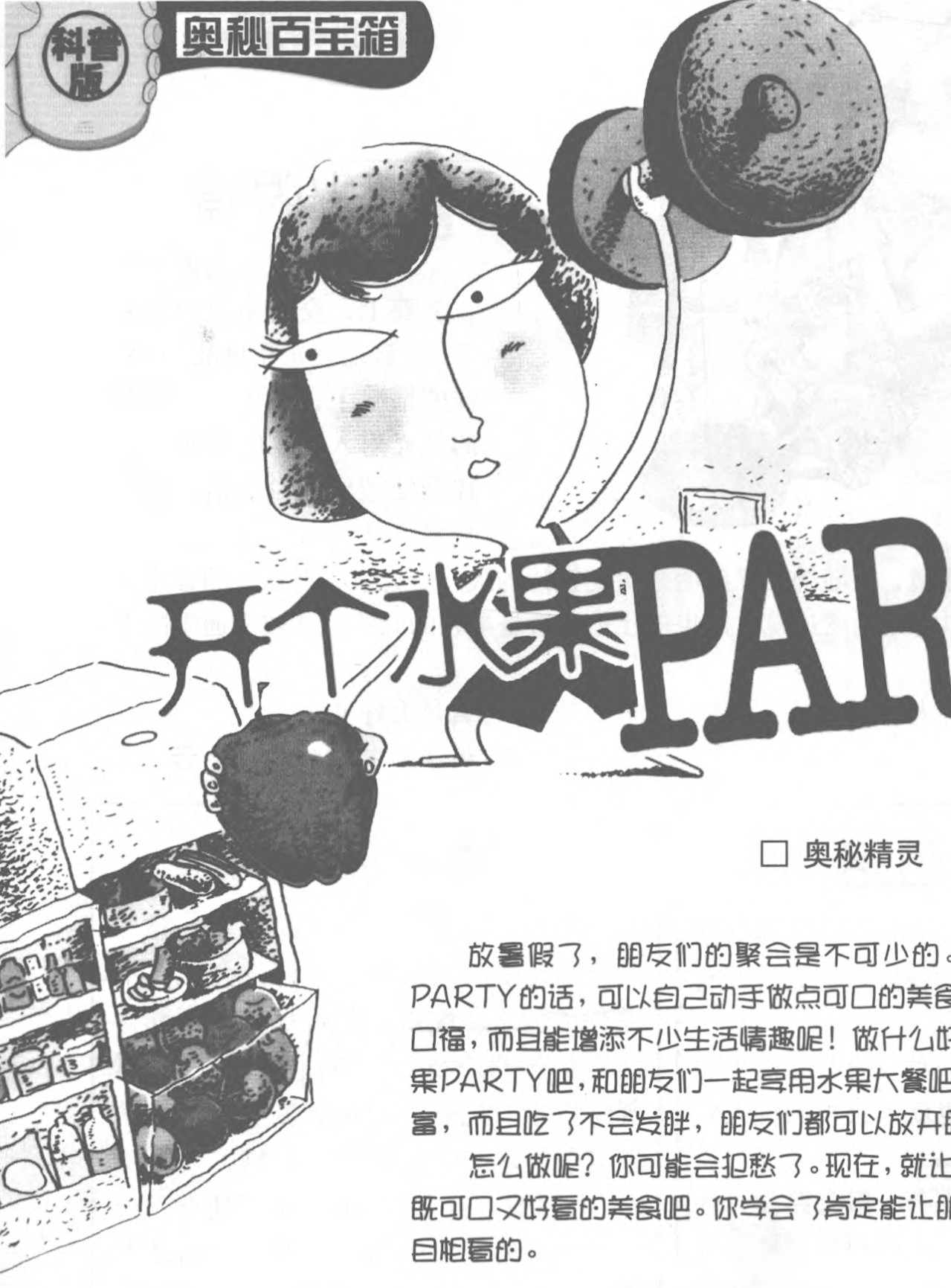 放暑假了,朋友们的聚会是不可少的。如果你想在家里开个PARTY的话,可以自己动手做点可口的美食,不但能让朋友们大饱口福,而且能增添不少生活情趣呢!做什么好呢?哦,水果! 开个水果PARTY吧,和朋友们一起享用水果大餐吧!因为水果不但营养丰富,而目吃了不会发胖,朋友们都可以放开肚皮吃。