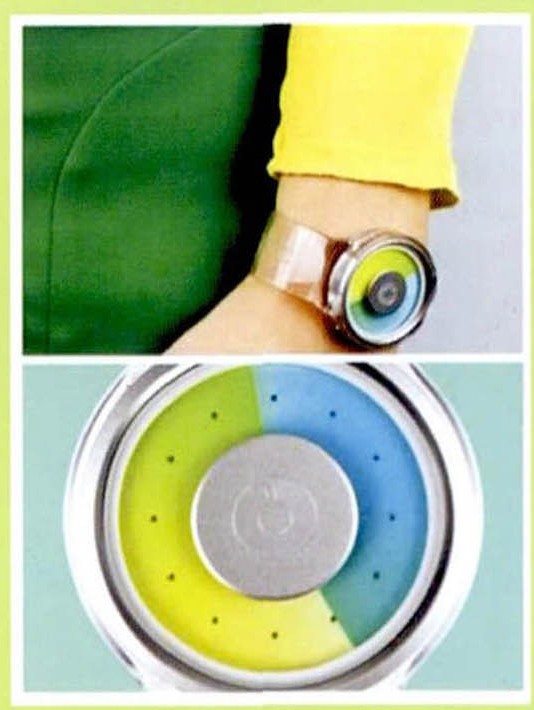 这是一款新的离子和质子手表,12个小孔代表着数字,而蓝色代表着小时,黄色则代表着分钟,通过它们在表盘上的颜色渐变来告诉你时间。