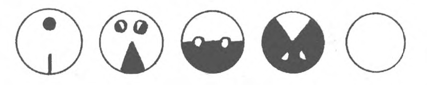 3.涂黑的面积发展到第5个小图必定是整个大圆全黑,小圆到第5个图也必定是全黑。因此,可以推断第5个图是一个全黑的大圆。