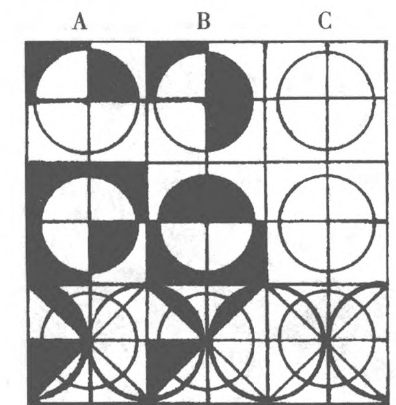 2.请认真地观察一下每一横行中A、B涂着黑色的部分,再根据其规律进行分析、判断,正确地填出每一行中的“C”处的图案。