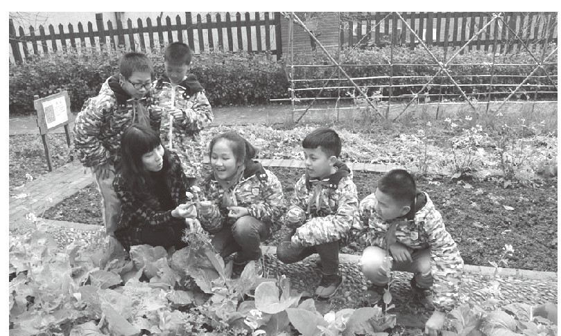 谭艳红老师带领同学们观察蔬菜生长情况