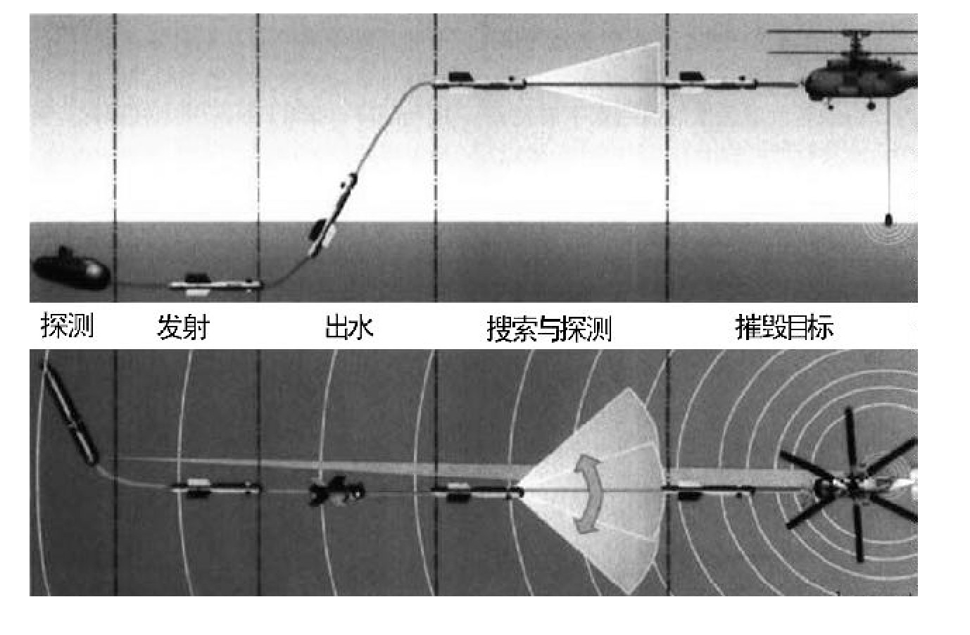 2.垂直发射后自动捕获跟踪目标。这种作战方式反应速度快,“发射后不用管”,但垂直发射的水下潜艇会因此暴露位置、招致攻击,尤其在面对多架反潜机的情况下,发射导弹后容易遭到其他反潜机的攻击。