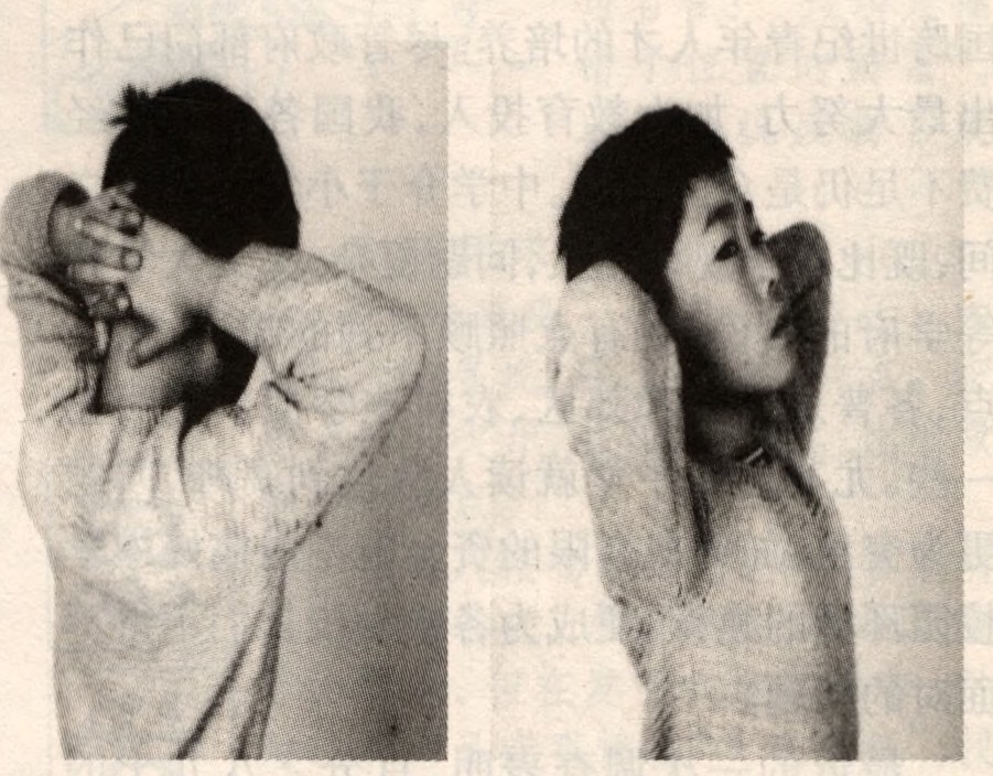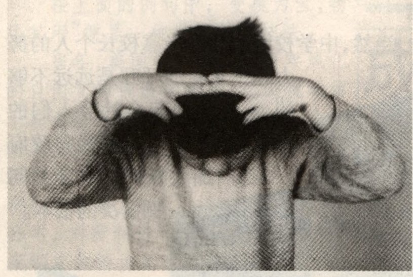 ⑤双手交叉抱住头部后下方,做颈部向后伸动作6~9次。
