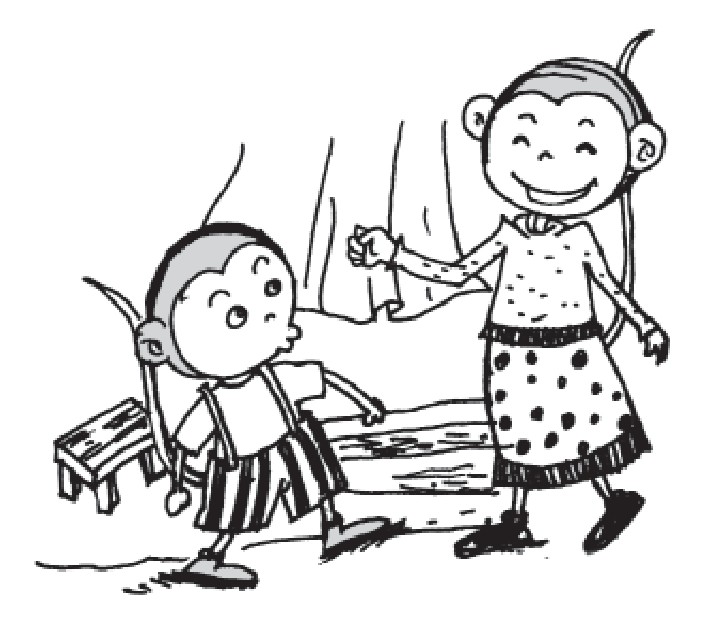5.(小猴子担心地拉着妈妈要去看鳄鱼。)