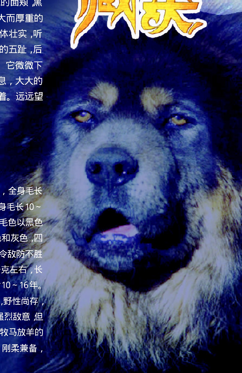 藏獒产于我国西藏和青海,全身毛长而密,能在冰雪中安然入睡,身毛长10~40厘米,尾毛长20~50厘米,毛色以黑色为多,其次是黄色、白色、青色和灰色,四肢健壮,善于奔跑,动如猎豹,令敌防不胜防。一只纯种成年藏獒重60千克左右,长约133厘米,肩高83厘米,寿命10~16年。