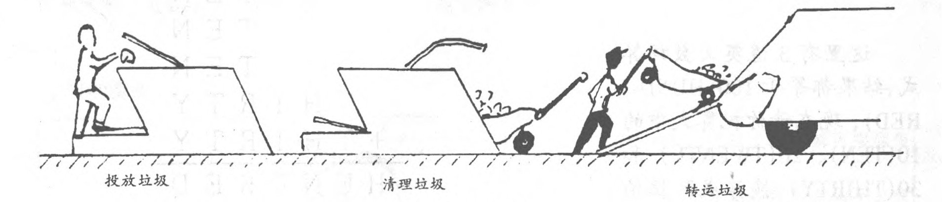 与垃圾箱相配,则有一种专门清理垃圾的小车。清理时小车进人垃圾箱清理门的下方洞中。打开清理门,垃圾就会滑入小车中。装满垃圾的小车推到垃圾装卸车的车斗处,应用杠杆原理可以轻松方便地将小车内的垃圾倒入装卸车车斗内。
