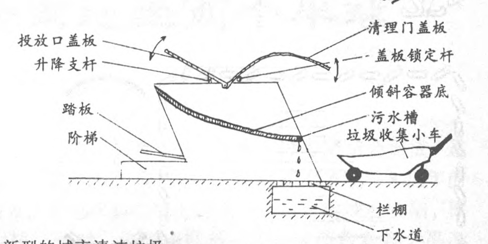 这种垃圾箱座落于单元楼出口的草坪上。垃圾箱的投入口由一扇自动门开或关,平时关闭以防蚊虫进入及臭味逸出。投放垃圾时人一踏上投放口的阶梯,自动门就打开。垃圾箱的内部是一个斜底的容器。清理垃圾时,打开清理门,垃圾就顺着这个斜底滑出,不易淤积。平时垃圾中渗出的污水也能顺着这个斜底下流到导污槽中,引入下水道,使箱内保持干燥。一段时间后可用垃圾箱旁设置的水龙头方便地冲洗垃圾箱内外。