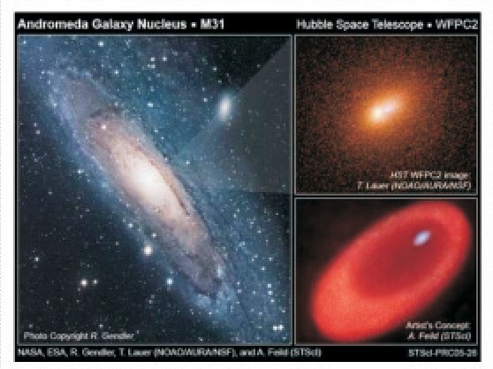 仙女座星系距离地球250万光年,它是人们肉眼观测可见的最遥远星体之一,在城市夜空中通过普通双筒望远镜便能进行观测。1991年,天文学家托德·劳尔使用哈勃望远镜装配的一号广角相机对仙女座星系内核进行了观测,他发现该星系拥有两个内核,两个内核相隔大约5光年。其中最明亮的内核就是普通观测时看到的,而另—个昏暗的内核,则位于明亮内核下侧。加拿大天体物理学家斯科特,特雷梅恩认为,另一个昏暗内核有可能是较明亮内核在星系中心黑洞的偏心轨道上形成的恒星盘投影。