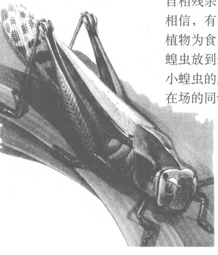 有一天,我捉了大大小小五六只蝗虫放到我自制的昆虫笼子里。第二天,我看到一只小蚱蜢的肚子烂了个口子,腿和触角也都没了。我心中顿生疑问:“难道蝗虫会自相残杀?”我和生物兴趣小组的同学说起此事,有的同学不相信,有的半信半疑,因为我们所掌握的知识表明,蝗虫是以植物为食的。于是我与同学一道捉了十多只蝗虫,我把最大的蝗虫放到最小的身上,结果大蝗虫竟大口地咬食小蝗虫,先把小蝗虫的腿和触角咬断,嚼碎咽下去,接着又啃小蝗虫的肚子。在场的同学看到这情景,不禁目瞪口呆。