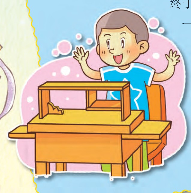 总听同学们抱怨,课桌怎么才这么一丁点大,放得了这个,放不下那个。我就想发明一个多功能桌椅,解决同学们的问题。经过多次实践,我终于成功了。我发明的“多功能桌椅”有如下优点:一、可以根据不同同学的身体特点,设计可调节高度的桌椅;二、两边使用三角形角铁支撑,在有些课堂上或家里可以向两边伸展,扩大使用面积;三、中间部位可以进行调节升降,用来放置书本和各种笔,具有层次感,容积更大;四、整体美观精致,可收缩伸展,机动性大且稳定性强。