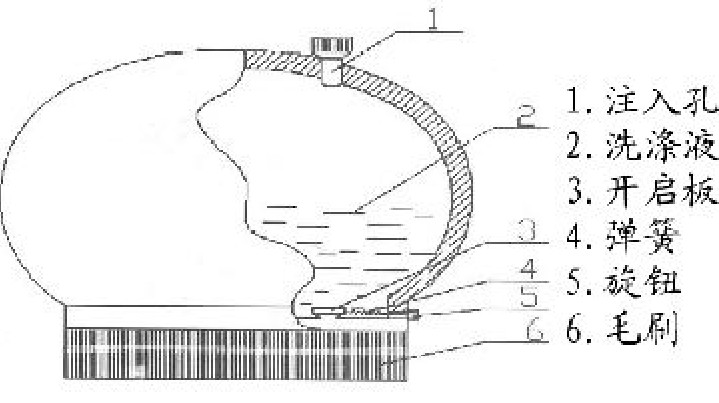 日常手洗衣服时,我们常常一只手按住衣服,另一只手拿洗衣刷来刷洗衣服,时而还要停下来添加洗涤剂或柔顺剂,很不方便。针对这个问题,胡景开同学就想,如果刷衣服的同时能有洗衣液自动流出该多好呀!功夫不负有心人,最后他终于设计出一种安装了可控洗衣液装置的精能洗衣刷。使用时,将洗衣液通过注入孔倒进装置里,只需将旋钮旋出,这时旋钮内置的开启板打开,液体流入板下的缝隙,当移动刷子时,液体沿着毛刷流到衣物上,这样就可以一气呵成地刷衣物了。