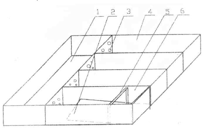 如图所示,蟑螂捕捉器的主体是一个含多个互相隔离腔室的盒体,盒体中至少有一个可封闭的腔室是放置诱食的诱食仓,诱食仓设置有方便放入和更换诱食的抽斗或门、盖结构。还有一至多个腔室捕捉室,捕捉室可以设置在诱食仓的一侧或多侧,也可以围绕在诱食仓的四周或上下。捕捉室前端设置有安装在门上方的门轴和绕门轴向内摆动的活动门;捕捉室的后端或一侧设置有与诱食仓相通的透气孔;捕捉室的底部设置有翘板结构,翘板轴承设置在翘板距门一侧较近的非重心点位置之下。在翘板上表面两侧的轴承位置的上方设置有撑杆,撑杆上还设置有摆动门,摆动门掀起后正好可以搭在上面的横梁上。捕捉门的前方设置有防止摆动门向外摆动的止逆结构。