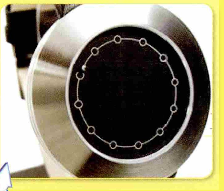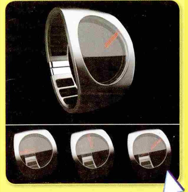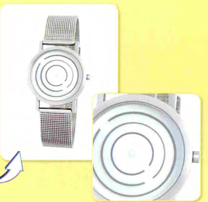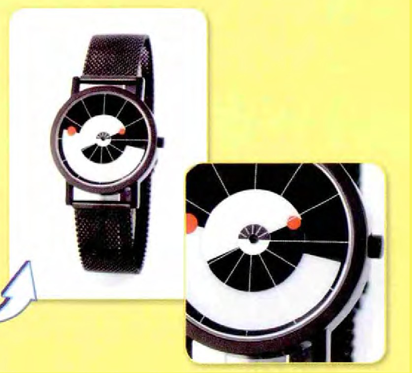 这款手表没有指针,而是用表盘上三个大小不一的同心圆弧表示时间。圆弧由内而外分别表示时钟、分钟和秒钟。这三个圆弧不停地沿各自轨道转动,好似天上的星辰运转。