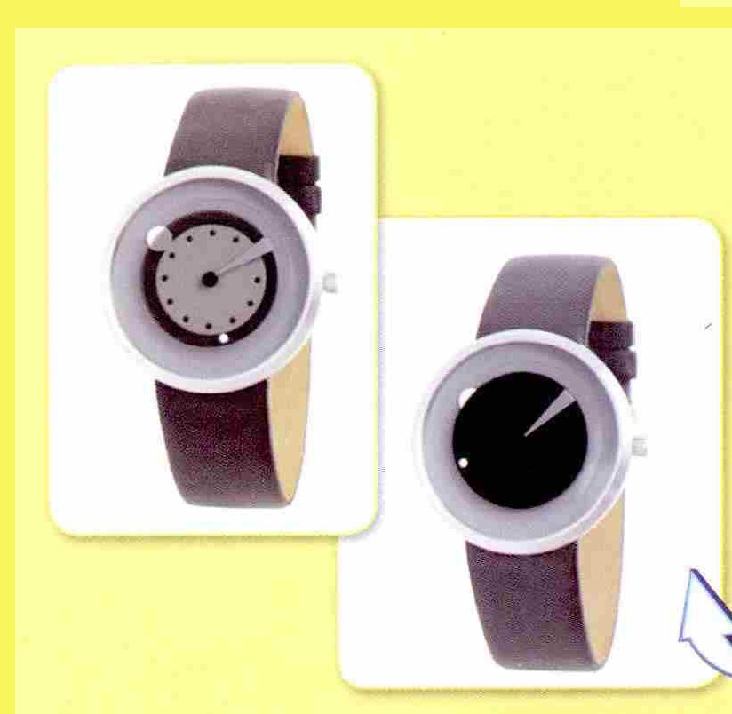 这款手表的灵感源于飞机的地平线仪表装置。两个大小不等的红点分别表示时针和分针,它们转动时表盘的黑色和白色区域会发生变化,但始终会在所指的时间线上平分黑白两色。