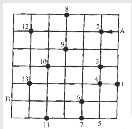 要从A处按箭头所示走到B处,在1~13的黑点处,可以左右上下走动,而在其他十字路口只能直行,在“T”字路口只能朝左拐弯,应该如何走?
