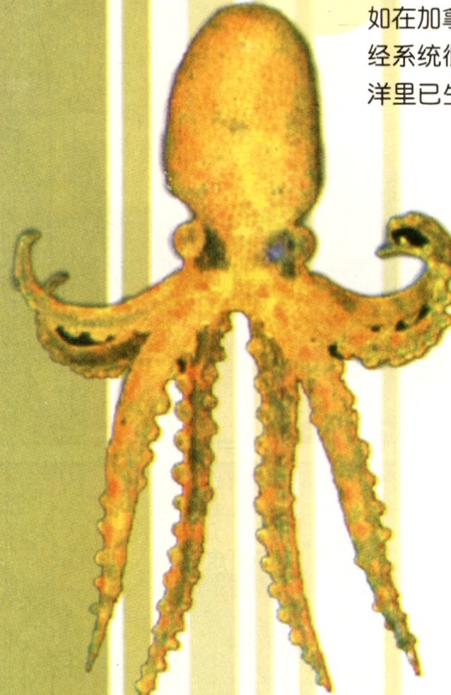 章鱼并不是鱼,它是一种古老的海洋生软体动物。成年的章鱼一般直径约3米,重30千克左右。有时候人们也会发现一些巨型章鱼,如在加拿大西海岸发现的至今最大的章鱼,长度达75米。章鱼的神经系统很发达,它常被认为是海洋里最聪明的无脊椎动物,它们在海洋里已生活了 5000万年。