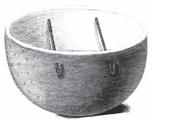 2把两枚曲别针拉直,针的两端弯成直角穿入小船两侧的船身,使它向内弯曲,别针与柚子皮的底部之间保持一定的距离,这个距离要稍高于小蜡烛头的高度。