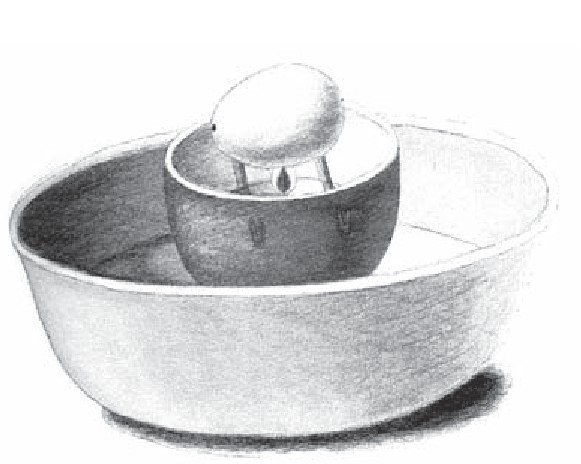 5把鸡蛋壳摆放在两根铁丝上,在壳里注入少量的清水,这就是小锅炉了。