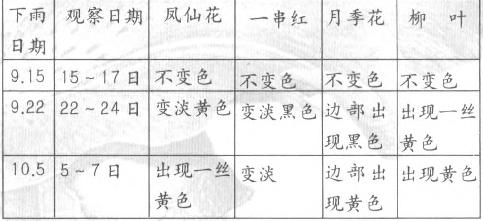 1.花草在酸溶液中出现的现象与校园花草在雨后的变化完全相同。可以肯定,校园里花草枯萎现象是受酸雨影:响的结果。