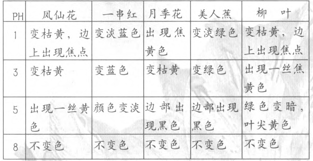 2.花朵在酸溶液中颜色都会变浅,随着酸度的不断加强,花朵的颜色不断变浅,越来越不鲜艳。草在酸溶液中会出现一丝黄色,随着酸度的不断加强,淡黄色会变成土黄,直至枯萎。