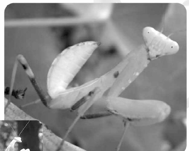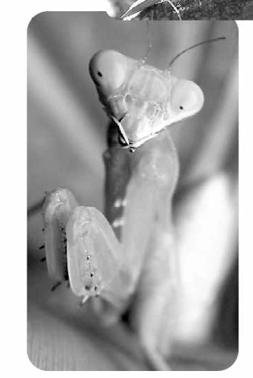 螳螂的外表并不令人生畏,相反,看上去它相当美丽,它有纤细而优雅的姿态,淡绿的体色,轻薄如纱的长翼。颈部是柔软的,头可以朝任何方向自由转动。这种昆虫能向各个方向凝视,真可谓是眼观六路。