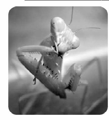 在它休息的时候,这个异常勇猛的捕捉其它昆虫的机器,只是将身体蜷缩在胸坎处,看上去,似乎特别平和,甚至会让你觉得,这个小动物简直是一只热爱祈祷的温和的小昆虫。但是,只要是有其它的昆虫从它们的身边经过,螳螂的那副祈祷和平的相貌便会一下子烟消云散了。这个刚才还是蜷缩着休息的小动物,立刻便伸展开它身体的三节,于是,那个可怜的路过者,还没有完全反应过来,便已糊里糊涂地成了螳螂利钩之下的俘虏了。无论是蝗虫,还是蚱蜢,或者是其它更加强壮的昆虫,都无法逃脱这四排锋利的锯齿的宰割。它可真是个了不得的杀虫机器。