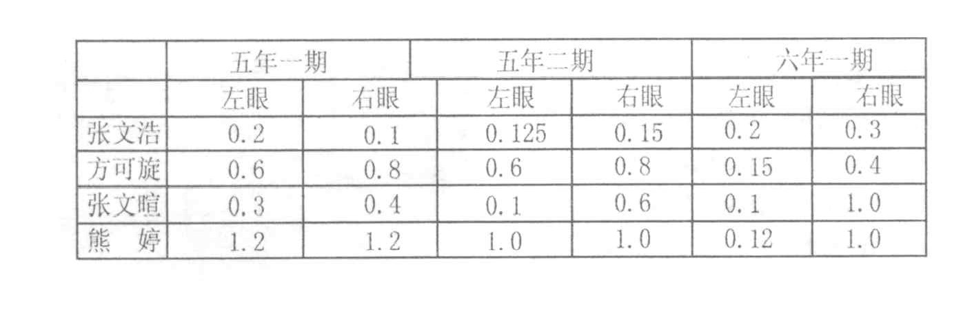 调查后我还发现张文暄同学的视力比原来好了一点点,尤其是右眼的视力接近正常,我与他谈话后得知,他注意了用眼的卫生,经常在下课时有意识地进行体育活动,有时还向远处眺望,让眼睛得到充分的休息。但他说,他写字喜欢将头偏向一边,想改也改不掉。我终于找到了他视力差异的原因:他看书、写字,总是用其中一只眼睛,这样就难以避免地造成了两眼视力的差别。