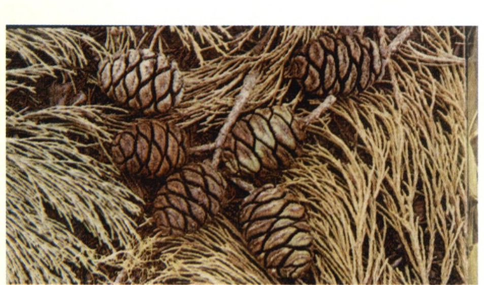 图②巨杉细小的枝和鳞状叶及鸡蛋大小的球果。
