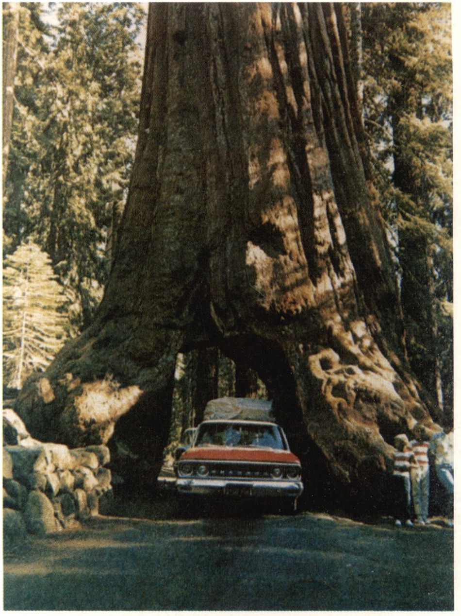 图①这就是跨立在约斯迈特国家公园公路上的巨杉树,中空的树干基部已成可通汽车的隧洞。