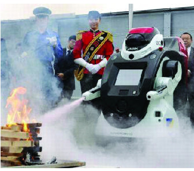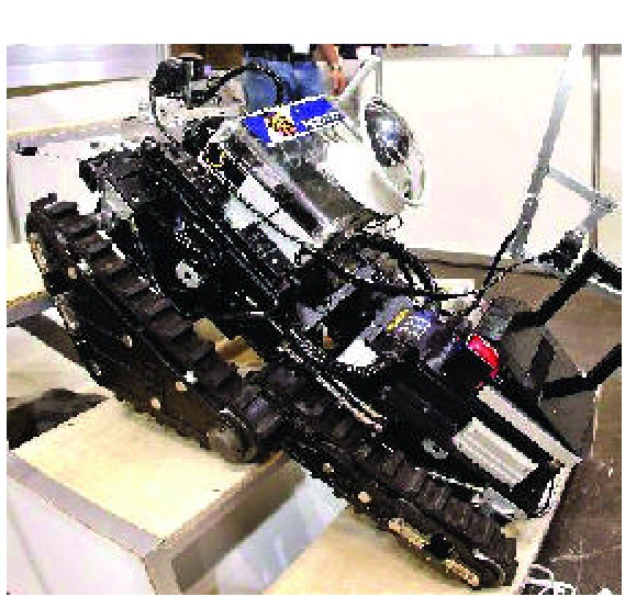在第六届上海国际消防技术设备展上,上海科研人员展示了自行研制的国内首台“机器消防侦察员”。这台机器人长1.2米、宽0.5米、高1.55米,重约300千克。关节履带能使机器人适应多种地貌,能自如进退、转弯,能跨越0.25米高的障碍物、爬30度的楼梯,最快行走时速可达3千米,是目前国内外同类移动机器人中的佼佼者。