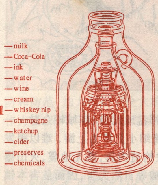 图中共有大大小小的玻璃瓶十二个,你知道各类瓶子的用途吗?现在从最小的瓶子为1号开始,在左列的十二种饮料或瓶内盛物的英文单词中对上号,并且说出中文名称来。