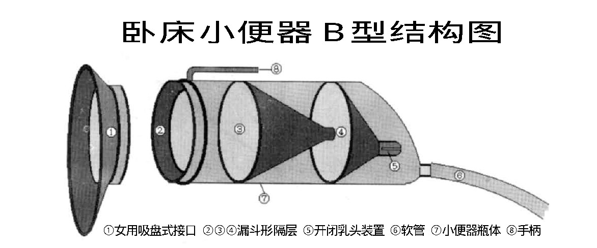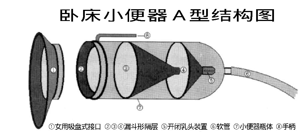在一个由圆柱体和半球体组成的瓶内,装上三层漏斗形状并能防倒流的隔层(如图所示)。在第三隔层的锥部装上开闭自如的乳头状装置,该装置既能防止尿液倒流,又能防止气味散发。在半球体底部的小孔处接上软管,确保尿液顺利流出。若在小便器前端嵌装上吸盘式接口,可供女性使用。制作的大、中、小三种型号的卧床小便器解决了卧床病人排尿不方便的难题,受到了卧床病人和护理人员的欢迎。