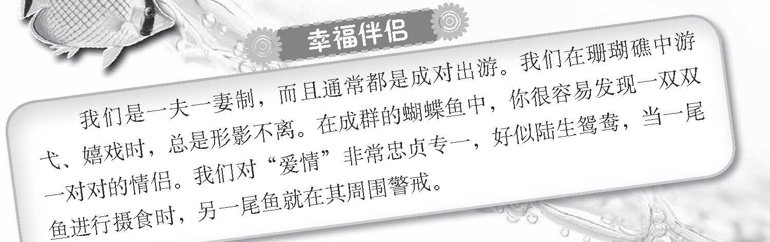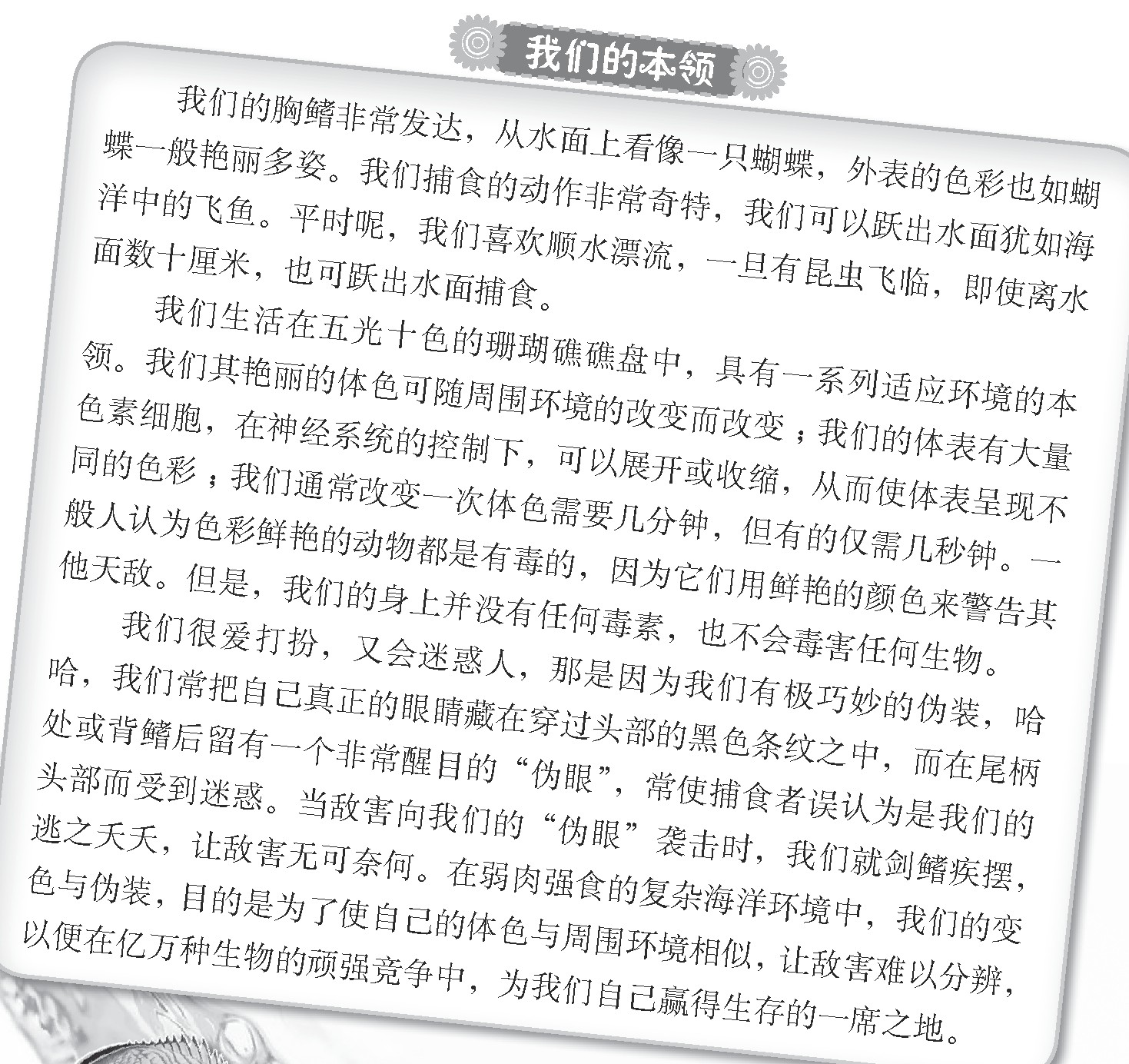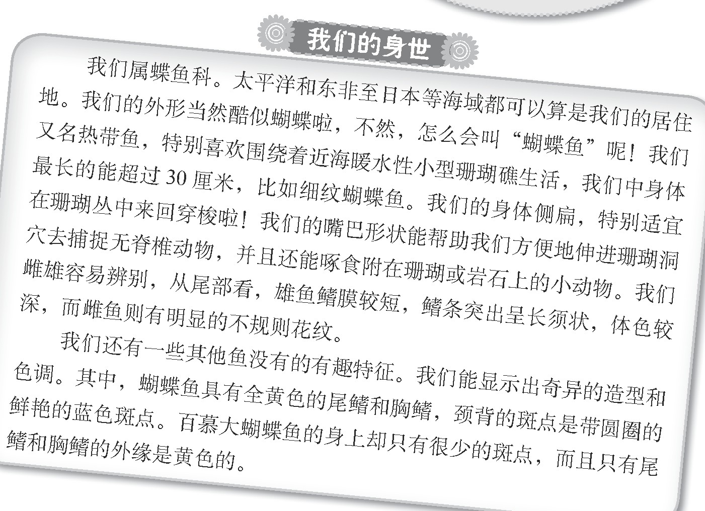 亲爱的同学们,你们好!在沿海各地的水族馆中有我们的兄弟姐妹——我们的外表非常耀眼绚丽,有着五彩缤纷的图案,像蝴蝶那么夺目于是,人们给我们取名为蝴蝶鱼。本期,我有幸荣登“封底明星”啦。你想知道我们的身世吗?