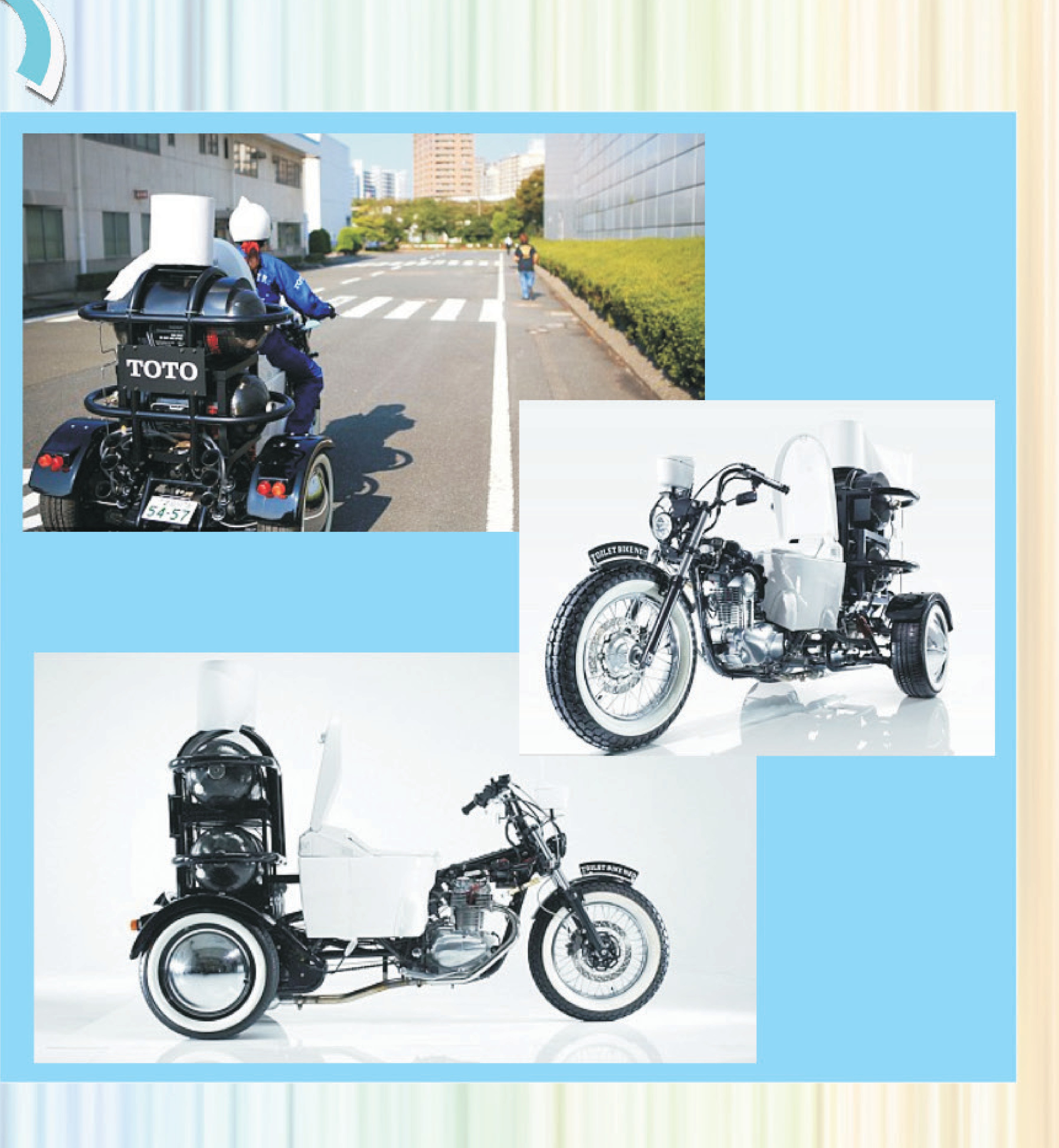 这是一款“烧”粪便的摩托车,变粪便为生物燃料。这一怪异的发明被形象地称之为“马桶摩托车”。它采用一个经过改造的马桶,并利用一个移动实验室处理排泄物。制造者希望这种移动厕所能够在未来几年内将二氧化碳排放量减少50%。“马桶摩托车”采用三轮设计,最高时速可达到80千米。