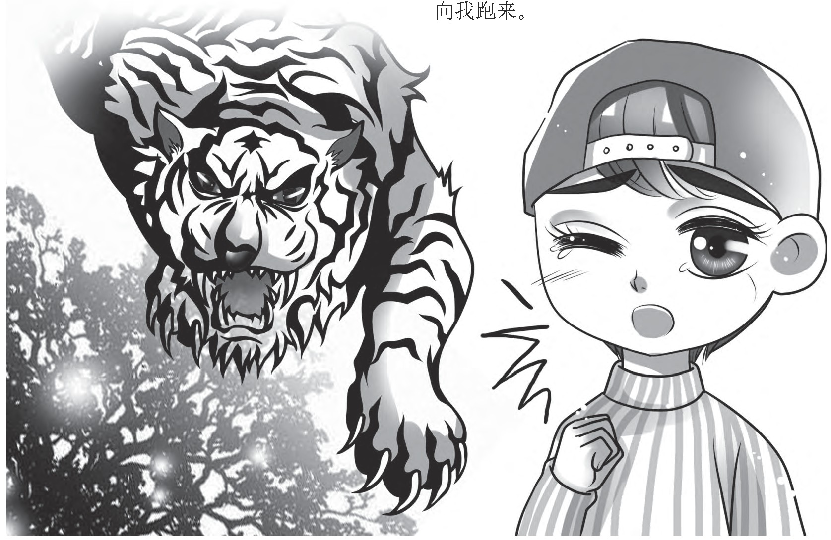 突然,一只巨大的野兽从树丛后面跳了出来,它凶神恶煞地盯着我,就像要把我吞进肚子里一样。我顿住了脚步,被眼前的一幕吓呆了。野兽张牙舞爪,黏稠的口水从尖利的牙齿上一滴滴滑落,恶心得令我有些反胃。