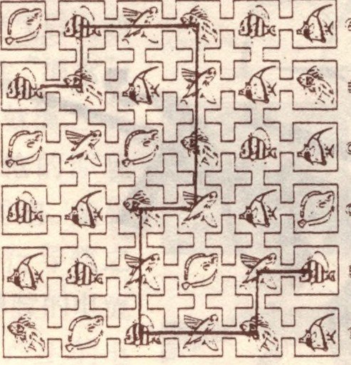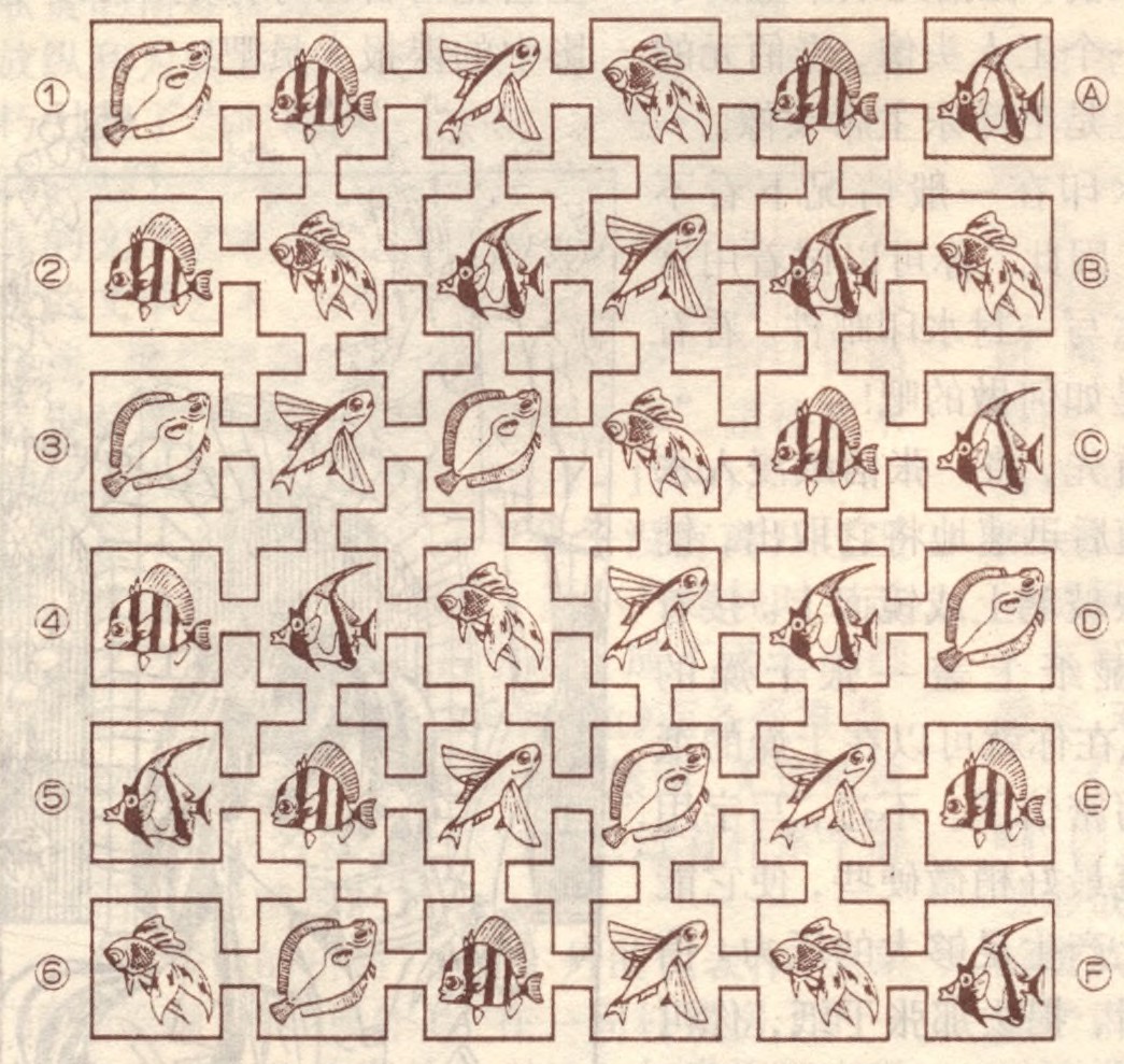 从左列①~⑥任意选择一个入口出发,然后走到右列A~F任何一个出口为止,一路上所经过的鱼类不能超过四种,试一下吧!