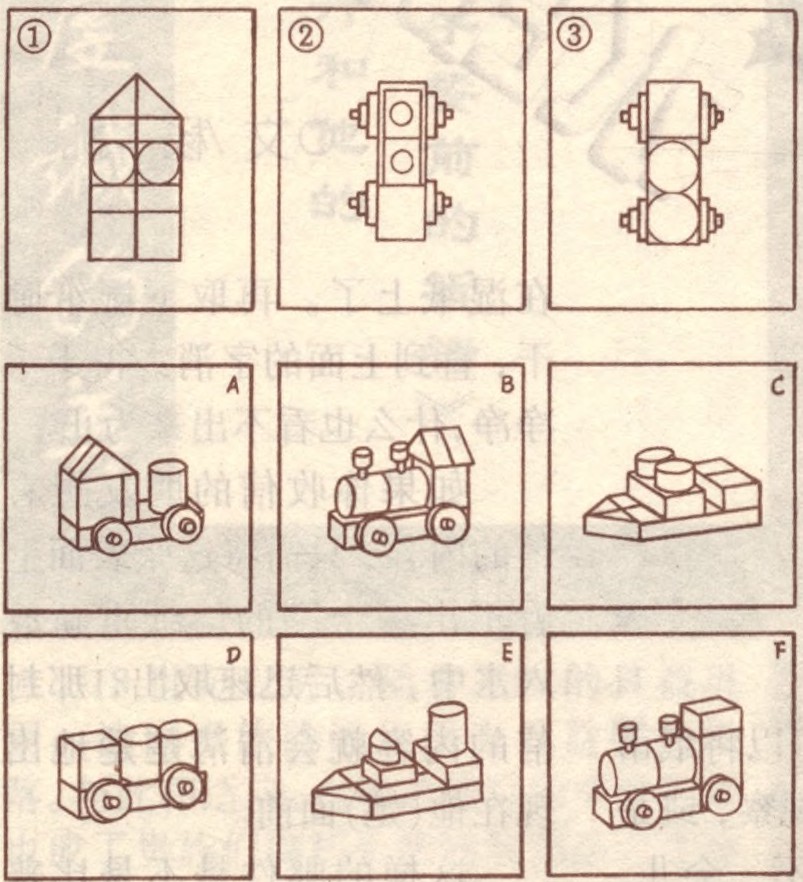 图中1、2、3俯视图各是A~F实物的哪一件?