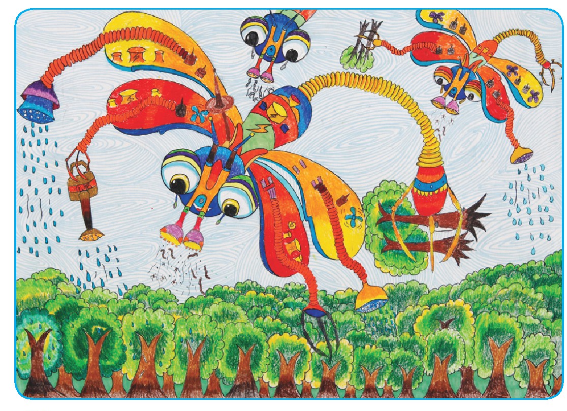 这是我发明的仿生蜻蜓护林机,能帮助人们护林。它是根据蜻蜓的外形设计出来的,它的每一对翅膀都有特殊功能,可以完成植树、浇水、施肥、灭虫等一切护林工作。