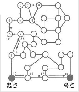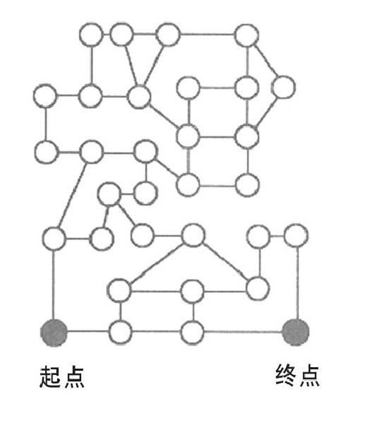 从标有“起点”的圆环到标有“终点”的圆只有一条路允许走,这条路要求走过偶数个路段。你能找出可以走的最短路径吗?