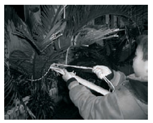 一天,我从电视台看到一部介绍未来机器人的影片,机器人的手臂能伸长缩短,用途很广。我突然得到灵感:要是像机器人那样能用伸长的手臂来包铁树该多好!经过反复试验研究,在科技辅导员曹老师的协助下,我终于做出了类似机器人手臂的包铁树工具。这个工具由两根长约80厘米的方木棍组成,木棍一端安装了一个方便绳子穿过的小铁圈,木棍中间有个突起的支点装置,用来固定拉紧的绳子,一根木棍有凹槽,另一根木棍有凸起,凹凸处正好吻合,目的在于拉绳的时候,两根木棍咬合在一起,旋转木棍便可收紧绳子,不需要再给绳子打结。使用时,先将木棍上的绳子绕在铁树下端,然后抬起木棍夹拢铁树,再合拢木棍收紧绳索,最后旋转木棍给绳索打结,这样铁树很快就包扎好了。