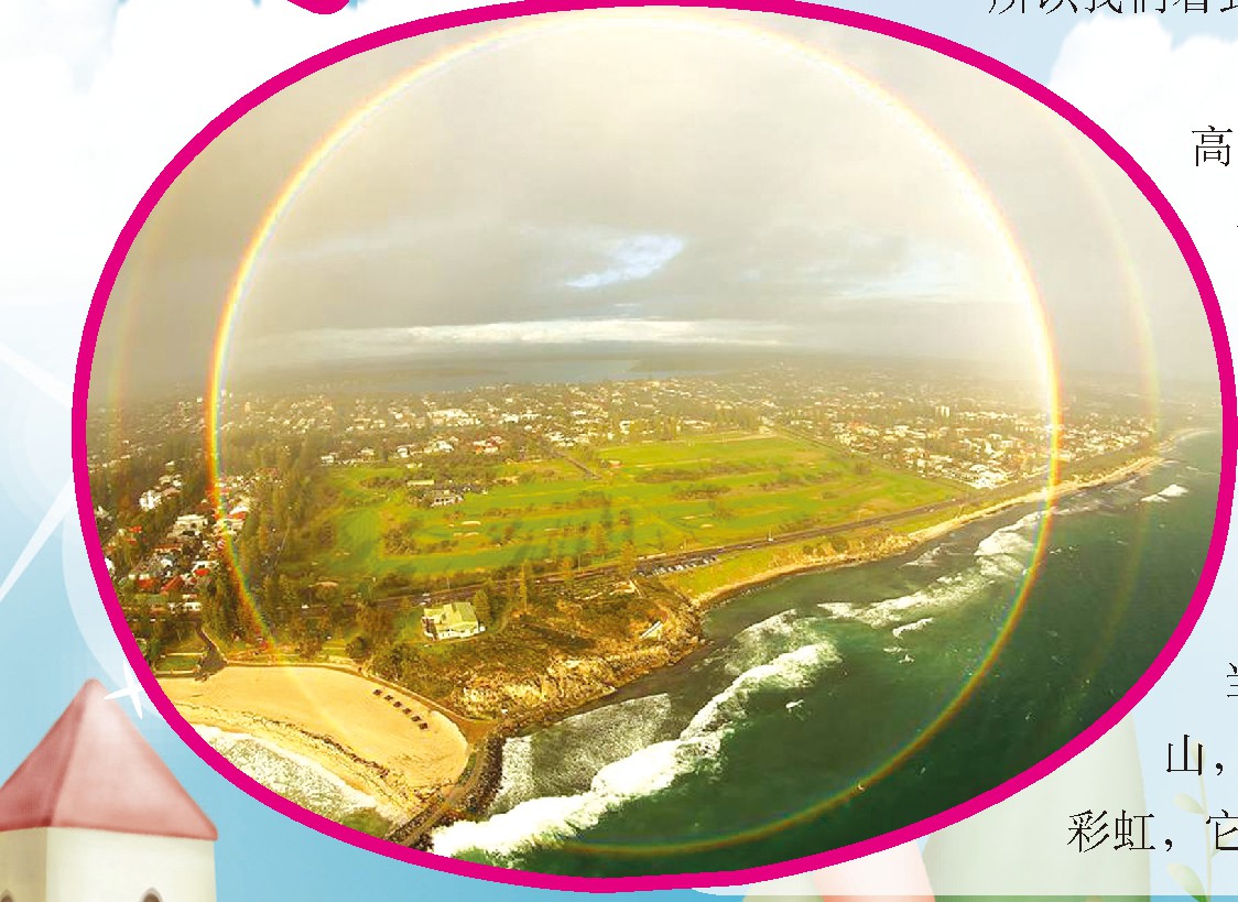 其实大多数的彩虹都是一个完美的圆环形,但是我们很难看到完整的环形彩虹。这是因为彩虹总有一半在地平线以下,被地面遮挡,所以我们看到的彩虹大多数都是一个半弧。