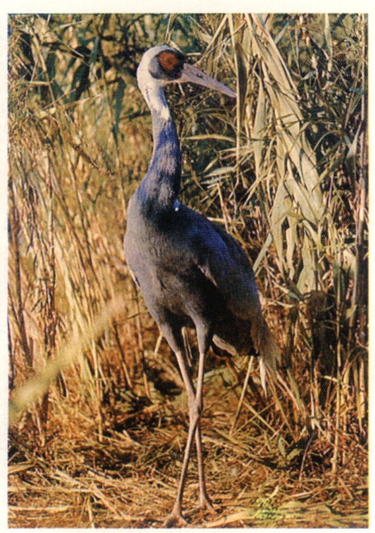 ▲白枕鹤:体长可达1米,头顶、后颈及颈部两侧为白色,额部及两颊裸露呈红色,因此又叫红面鹤、白顶鹤。迁徙鸟类,以小鱼虾为食,分布于内蒙古、黑龙江、吉林、辽宁、河北、江苏、福建、安徽、台湾等地。