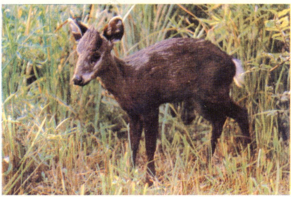 ▲牙獐:又名河麂、獐,小型鹿类,棕黄色,体长约1米,重约10公斤,雄性无角,但上犬齿长大而弯曲,露在唇外,尾短。分布在我国长江流域各省,栖于芦苇河岸、湖边、沼泽地以及丘陵地区的灌丛山坡或矮树林中。
