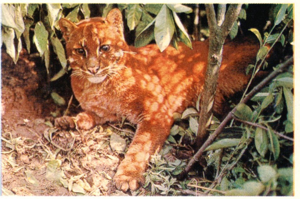 ▲金猫:又名原猫、狸豹、乌云豹等。体型与家猫相似,但略大,长约75 ~ 110cm,尾长40 ~ 60cm,重约10 ~ 15公斤,体毛红棕色,背有4条条纹,体侧有棕黄色斑点,两眼之间有白色眉纹,尾线黄色,尾尖栗黑,色型变化较多。生活在热带、温带森林,主要以小型兽类和雉鸡为食,分布于西藏、陕西、甘肃以及华中、华南、华东绝大部分省区。