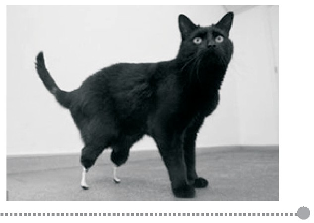 这是一只后腿严重受伤的黑猫,它在英国兽医诺埃尔·菲茨帕特里克的帮助下,装上了2个仿生假肢,终于又可以站立了。这种世界首创手术的成功有望在不久的将来提升人类假肢手术的水平。