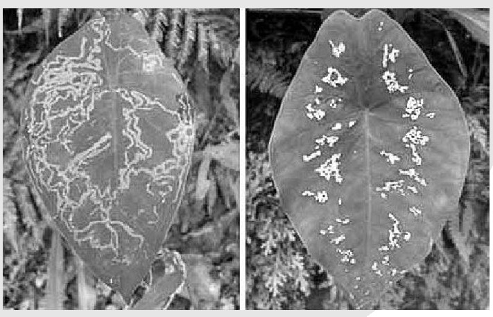 科学家在厄瓜多尔的雨林中发现了一种看上去像被攻击后的病态植物,这种奇特的绿色植物叶片能够通过光合作用的消失,让叶片上自然呈现白色轨迹,使掠食者以为叶片上曾有幼虫寄居,从而阻止其在叶片上产卵繁殖。