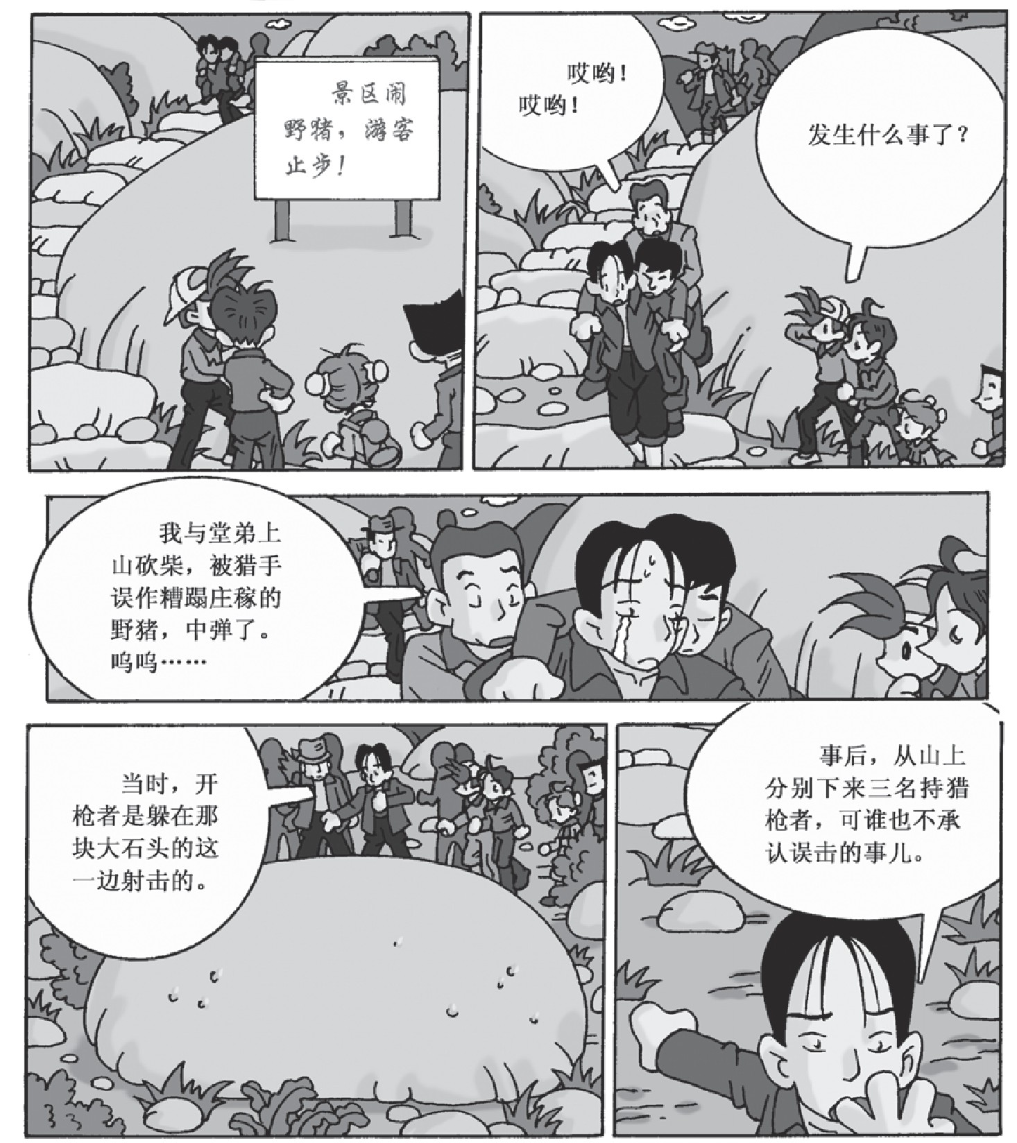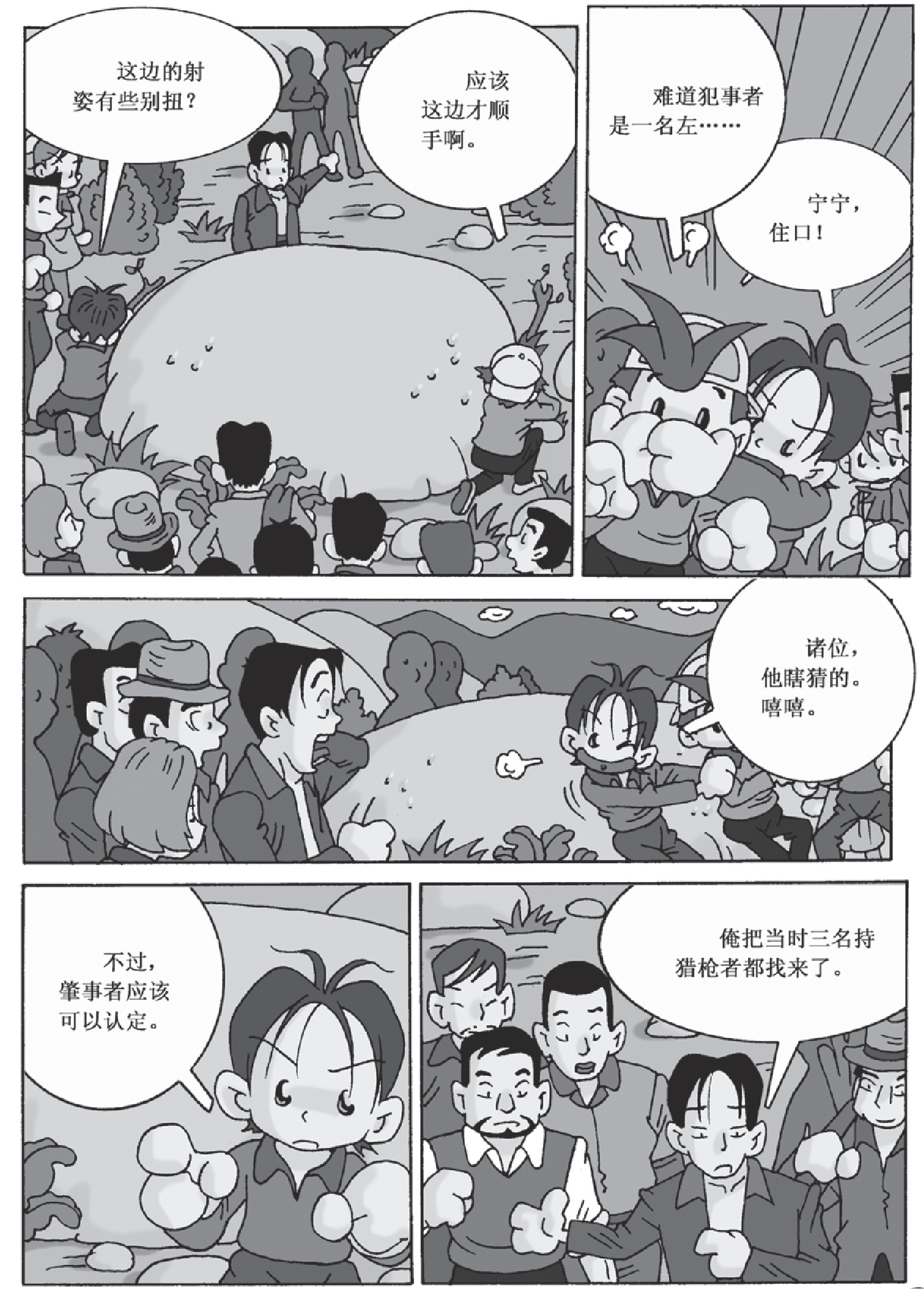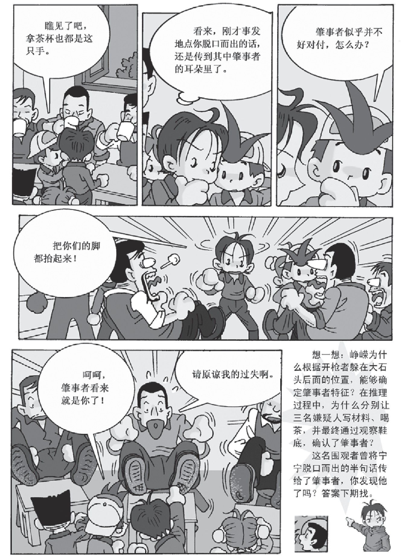 想一想:峥嵘为什么根据开枪者躲在大石头后面的位置,能够确定肇事者特征?在推理过程中,为什么分别让三名嫌疑人写材料、喝茶,并最终通过观察鞋底,确认了肇事者?
