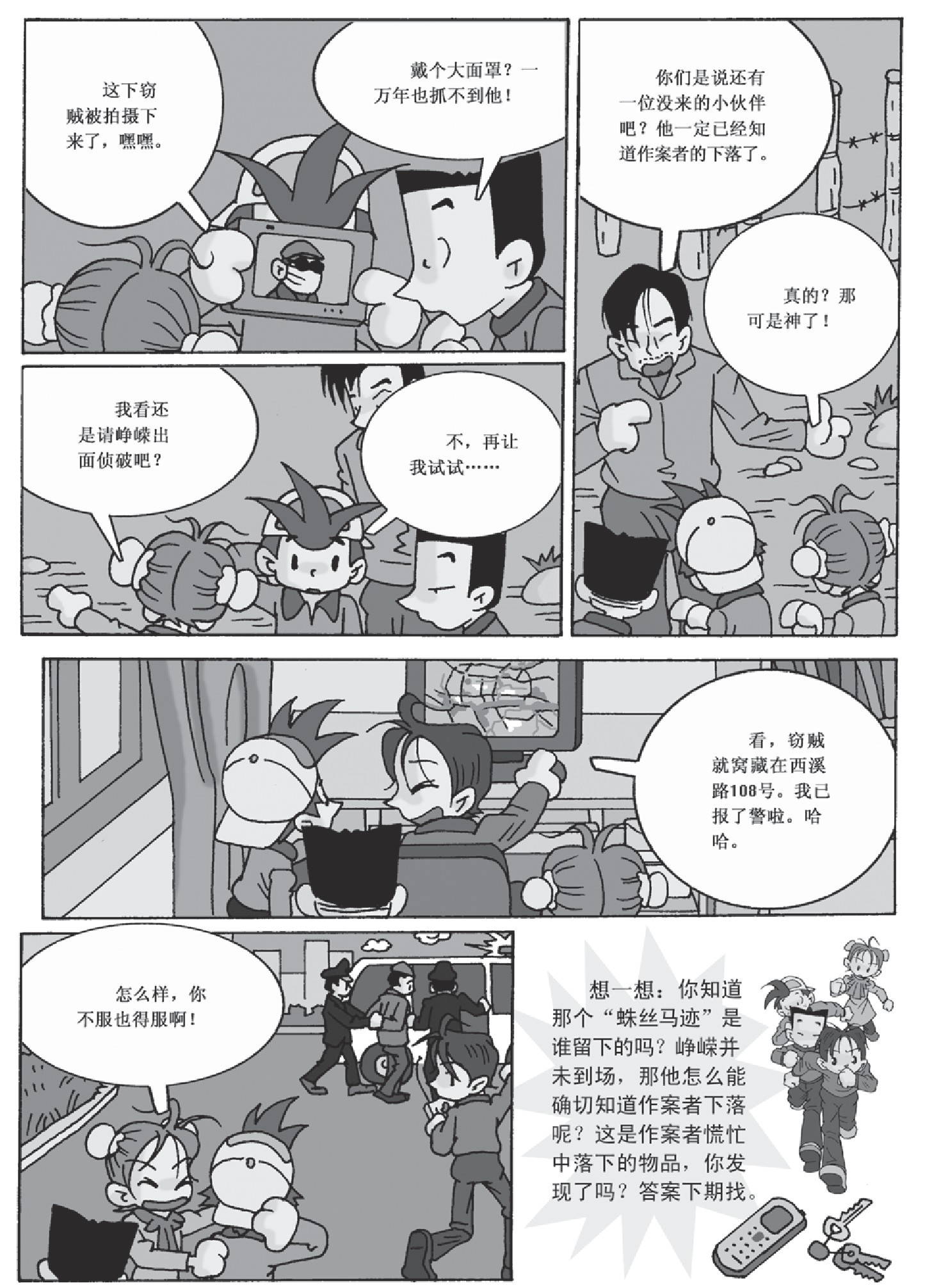 想一想:你知道那个“蛛丝马迹”是谁留下的吗?峥嵘并未到场,那他怎么能确切知道作案者下落呢?这是作案者慌忙中落下的物品,你发现了吗?答案下期找。